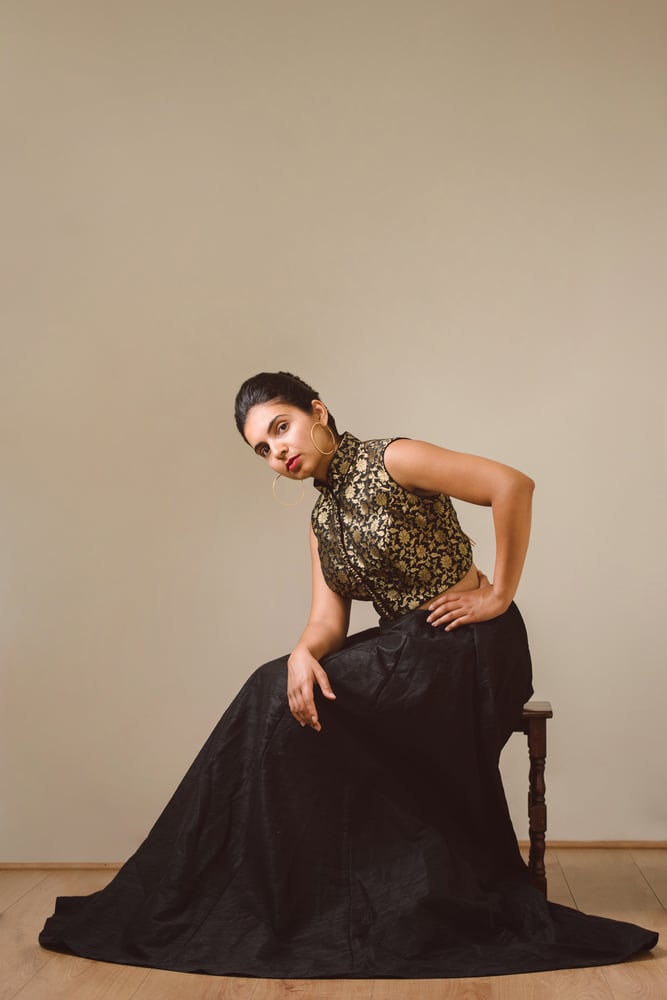 The Lengha is modelled from the long skirts typically worn by women in the suffragette period. The pattern on the collared blouse is a nod to Sophia's royal Punjabi ancestry, while the structure of the blouse - being sleeveless yet retaining the classic style of buttons - is reflective of the modern feminist